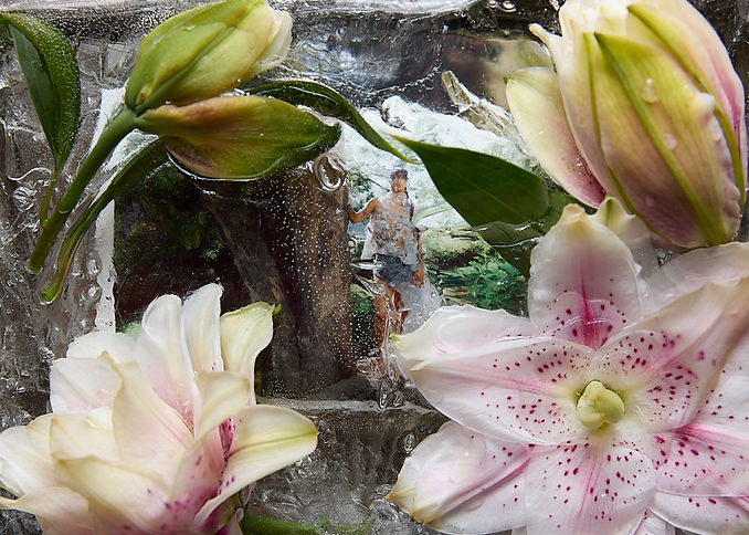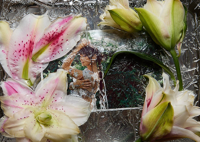 “The third and final scene is where our subject finds clarity and self expression from the understanding that culture cannot be preserved in the past or a place, but comes from within and we choose how we carry it with us. In this final set of images, the ice has cracked, melted and she is emerging in full bloom. The styling is an original design by Chinese-Vietnamese American designer Yao Mei Jing from her collection, “Blooming Through Chaos.”
